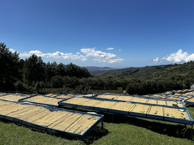 また、果肉除去後は、ウェットパーチメントをタンクに入れ、冷水、ミューシレージ、カスカラを足した状態で24時間の好気性発酵を行った上で、アフリカンベッドで約15日掛けて乾燥、仕上げていきます。